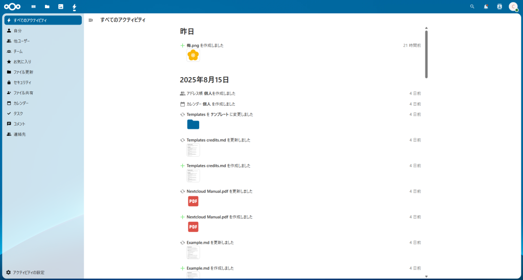 NextCloudには「アクティビティ」という機能があります。