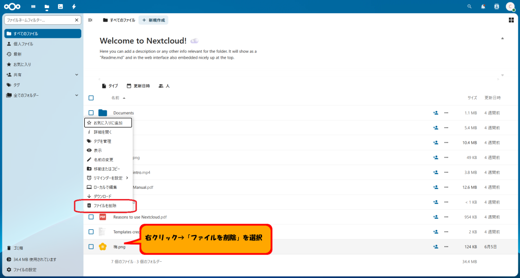 Nextcloud 一般利用者 【NextCloud】ファイルを削除するには? 2025.09.09 2026.03.27 この記事のタイトルとURLをコピーする ファイルの削除方法 不要になったファイルや、誤ってアップロードしてしまったファイルを削除するときの手順についてご説明します。 削除したいファイルを右クリックします。すると操作メニューが表示されますので、その中にある「ファイルを削除」を選択します。これでファイルの削除は完了です。 Post Share Hatena LINE RSS feedly Pin it note