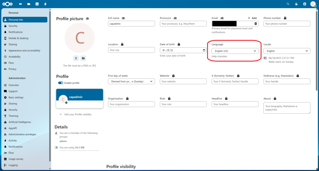 NextCloudは初期設定だと英語になっていることがあります。