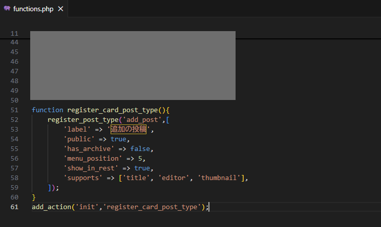 register_card_post_typeについては、名前は自由です。投稿タイプを登録する処理をひとまとめにしています。