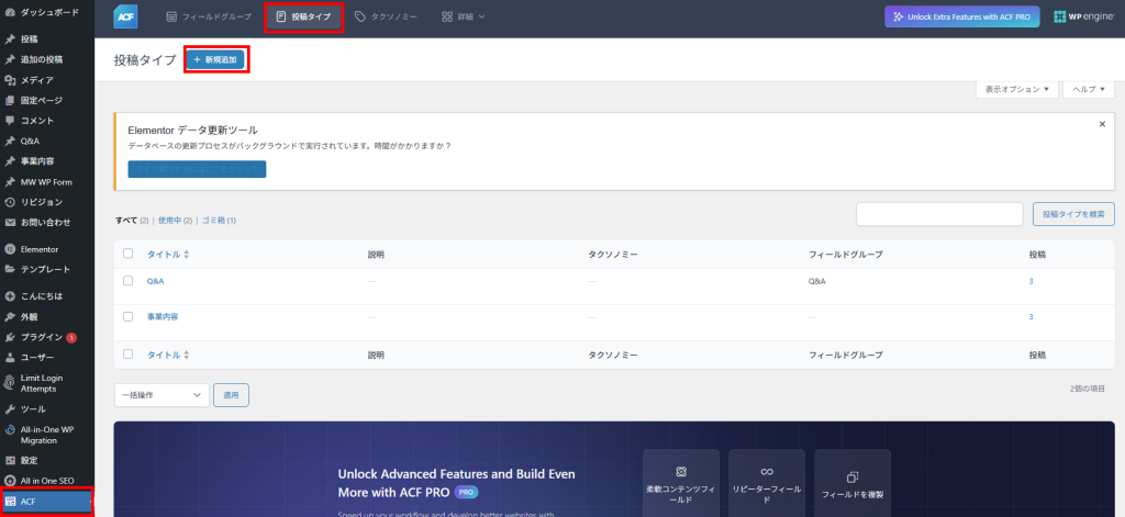 ダウンロードしたら、サイドバーに「ACF」が追加されます。