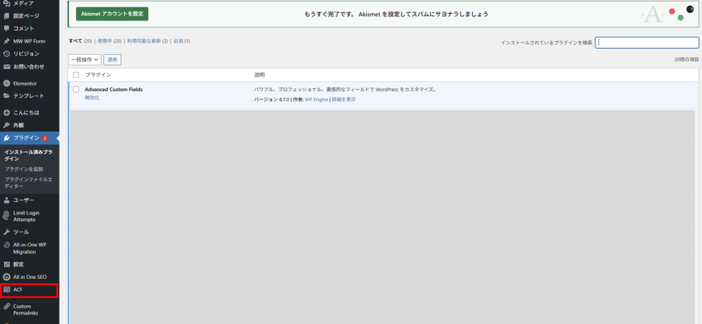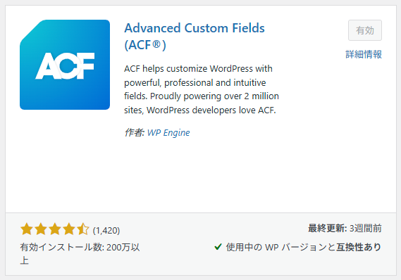 プラグインを追加から「Advanced Custom Fields」をダウンロードし、有効化します。