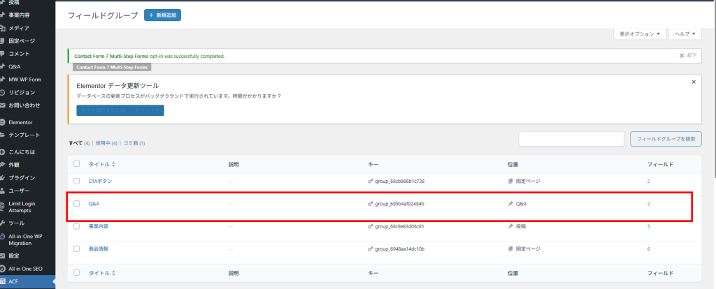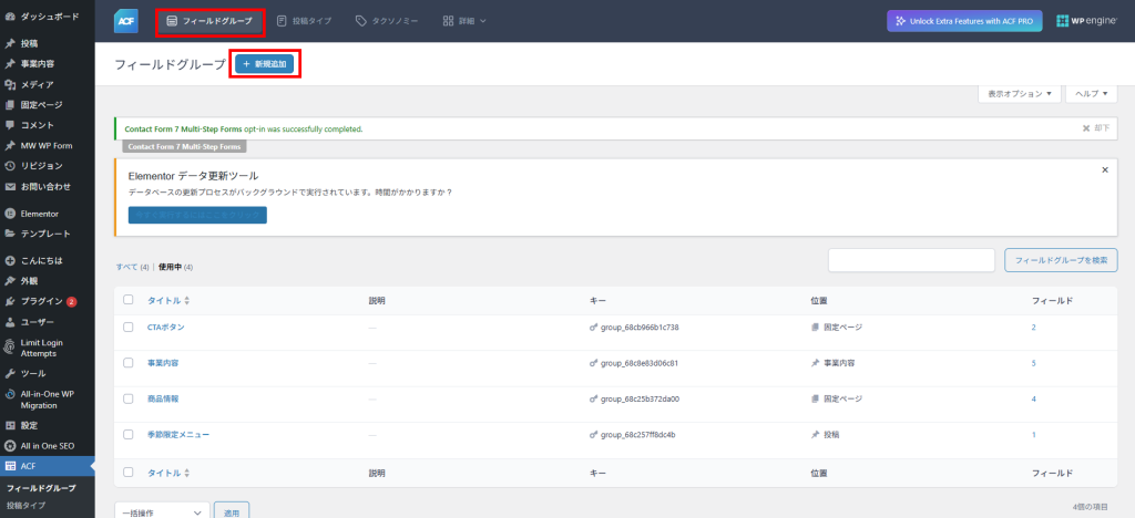 サイドバー「ACF」からフィールドグループを[+新規追加]していきます。