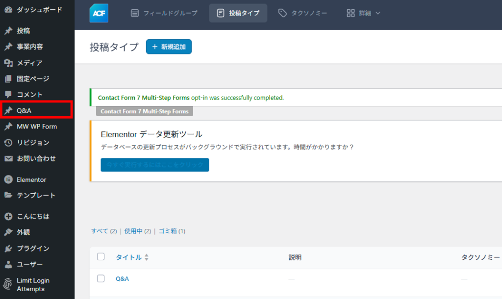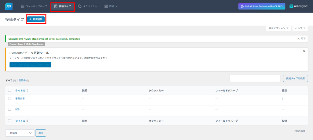 ACF 6.x以降では、投稿タイプを管理画面から作成できる機能が追加されています。本記事ではこの機能を使用します。