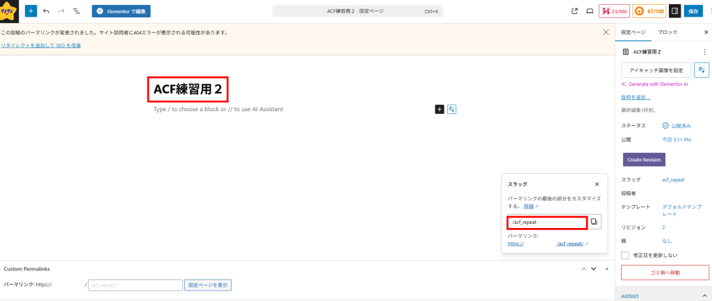 固定ページの右上、「スラッグ」を、今回は「acf_repeat」にします。