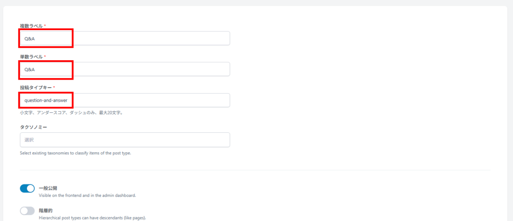投稿タイプを選択し、[+新規追加]から新しい投稿タイプを作成します。