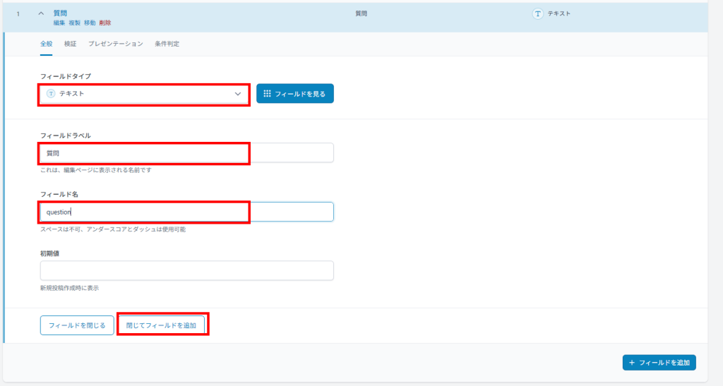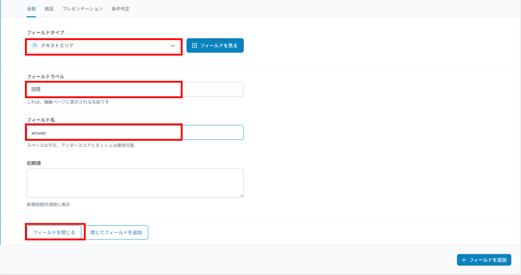入力できたら[閉じて新しいフィールドを追加]をクリックします。